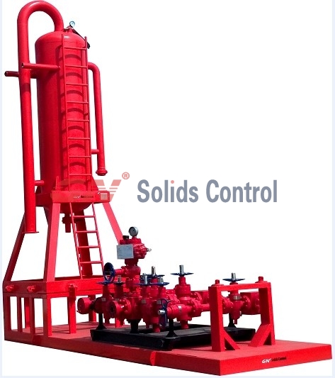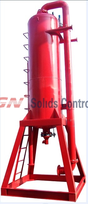 液气分离器是用于钻井泥浆中的气体分离设备。通常用于节流管汇之后,钻井振动筛之前,用于分离气侵泥浆中的有害气体。分离后的气体通过管汇引流到空旷的作业空间,通过电子点火装置进行燃烧。