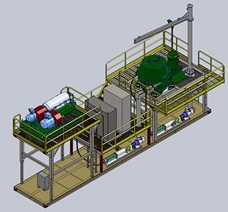工作时候,将钻屑甩干机和钻井液离心机的支架升高到最高处,能够满足钻屑甩干机的钻屑排放,以及 钻井液离心机的液相和固相排放,液相的排放可以直接通过重力作用将干净泥浆流入到储浆罐或固控系 统中去。